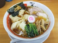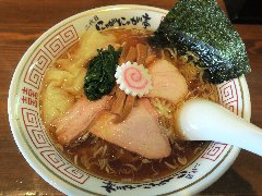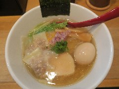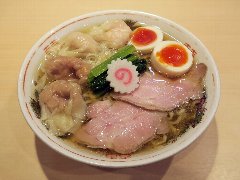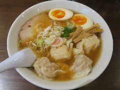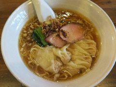 ![]() | 西荻窪駅北口から1、2分、駅前の正面にある路地を北に進むとあります。2階建ての建物の1階、何軒かの飲食店が並んでいます。白い暖簾が掛かっていました。店内は、カウンター席が7つ、小ぢんまりしていました。カウンターが低いので目の前で作る姿が見えます。ワンタン麺(ミックス)(1210円)を注文しました。海苔、メンマ。チャーシュー。ワンタン、刻みネギが入っていました。麺は中細でやや縮れていました。スープは魚介系と動物系の出汁、煮干しの風味が前に出ます。ワンタンは肉が2つ、海老が2つ、皮がつるっとして具がたっぷりでした。2種類の味が楽しめていいです。美味しかったです。他には、支那そば、チャーシュー麺などがありました。 |