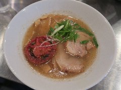 ビアビア | ラーメン | 東京都杉並区高円寺南 | ★★ (2017.5.27) | 普通 | ![]() | 東高円寺駅から1分、ニコニコロードという商店街にあります。Bia Biaとはペルシャ語でwelcomeの意味だそうです。木枠のガラス戸と壁の外観です。店内は、くの字のステンレスのカウンター席が8つありました。お洒落な雰囲気です。入口付近には製麺室がありました。ご主人は気さくなイランの方です。ロースト・トマトラーメン(塩)(900円)を注文しました。ローストトマト、穂先メンマ、チャーシュー、刻みネギ、魚粉、が入っていました。チャーシューはトロトロです。自家製の麺は細めのストレートです。スープは無化調、大山鶏と魚介系のWスープでカツオが強いです。美味しいです。トマトの酸味もいいです。他には、煮干しラーメン、茄子とトマトのピリ辛まぜ麺、坦々麺などがありました。 |