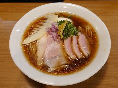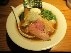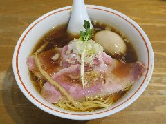 ![]() | 幡ヶ谷駅から4、5分、国道20号沿い、笹塚方面に向かうとあります。マンションの1階です。黒地に金字の看板です。店内は、カウンター席が14、和風の雰囲気です。特製鴨だし醤油ラーメン(1100円)を注文しました。たけのこ、味玉、チャーシュー、刻み玉ねぎ、刻みネギ、柚子が入っていました。チャーシューは鴨、鶏、豚の3種類です。麺は細めのストレートです。スープは鴨出汁、山形県の最上鴨を使用しているそうです。きれいな色で表面には鴨油が浮いていました。旨味がたっぷりですっきりした味わいでした。美味しかったです。他には、鴨だし白湯ラーメン、鴨だし魚介つけ麺などがありました。 |