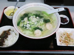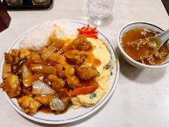 ![]() | 日暮里駅北口から1分、駅のすぐ近くにあります。マンションの1階です。ガラス張りの外観です。店内は、テーブルが多数ありました。すっきりときれいです。中華ランチ(1000円)を注文しました。スープが付きます。中華ランチは、ご飯と玉子焼きの上に餡が掛かっていました。甘酸っぱい中華餡には鶏肉、たけのこ、玉ねぎ、ピーマンなどが入っていました。卵焼きはふわふわ、下はキャベツの千切りです。けっこうボリュームありました。美味しかったです。でも味が単一でちょっと飽きます。他には、らーめん、五目焼そば、生姜焼き定食などがありました。 |