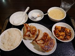 ![]() | 赤羽駅西口から2分ほど、駅のロータリーの向かいにあるBIVIOという商業ビルの地下1階にあります。扉が無く中が見えます。店内は、テーブルが多数ありました。割りと広いです。きれいで明るいです。一部のテーブルに何故かマネキンが座っていました。焼餃子ランチセット(740円)を注文しました。ライス、スープ、麻婆豆腐、ミニデザートが付きます。餃子は大きめで皮は手作りでもっちり、餡は肉が多めで肉汁が出てきます。ニンニクは入っていません。麻婆豆腐はまあまあ辛かったです。美味しかったです。他には、酢豚、五目つゆそば、五目炒飯、麻婆麺などがありました。 |
