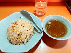 ![]() | 三河島駅から7分ほど、日暮里中央通りから狭い路地に入ったところにあります。3階建ての建物の1階です。オレンジ色の庇です。人気があるようで並んでいました。店内は、カウンター席が10、テーブルが3つありました。昔ながらな雰囲気、ご家族で厨房に立ってるようでした。チャーハン(750円)と餃子(500円)を注文しました。チャーハンはパラパラ寄り、玉子、チャーシュー、玉ねぎなどが入っていました。餃子はやや大きめ、野菜の甘味とニンニクが利いていました。美味しかったです。他には、ラーメン、タンメン、カレーライス、オムライスなどがありました。 |