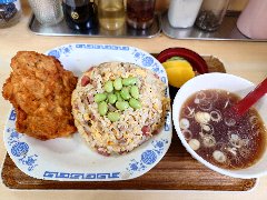 ![]() | 新高円寺駅から西に3分ほど、青梅街道沿いにあります。2階建ての建物です。オレンジ色の壁が目立ちます。店内は、カウンター席が4つ、テーブルが2つありました。レトロ感があります。ご主人とおばちゃんが切り盛りします。鳥唐チャーハンT(900円)を注文しました。スープと漬物が付きます。チャーハンに唐揚げが添えられます。チャーハンは、枝豆、玉子、ハム、チャーシュー、玉ねぎなど具だくさん、パラしっとりで量も多いです。やや塩分強めです。唐揚げは胸肉1枚、でかくて分厚くて熱々でした。ボリュームあります、美味しかったです。他には、ラーメン、オムライス、焼肉定食、ギョーザなどがありました。 |