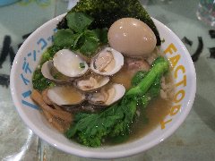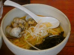 辛麺 真空 | ラーメン | 東京都町田市原町田 | ★ (2010.8.7) | 普通 | ![]() | JR町田駅の近く、線路沿いの繁華街にあります。人気店の胡心房の近くです。店内はカウンター席が10席のみ、何か雑然としていて清潔感が無い気がしました。何故かカウンターに化粧品が陳列されていました。メニューには山と海があります。海(750円)と炙りトロ豚丼(280円)を食べました。海にはあさり(結構たくさん)、あおさ海苔、長ねぎが入っていました。麺は中太の平打ちの縮れ麺です。スープは塩で辛油が浮いています。あさりや魚介の味が濃いです。炙りトロ豚丼には細切れチャーシュー、水菜、マヨネーズ辛子が入っていました。美味しかったです。因みに山は真っ赤な豚骨スープだそうです。 |