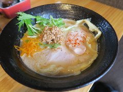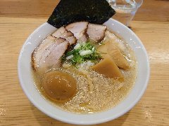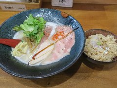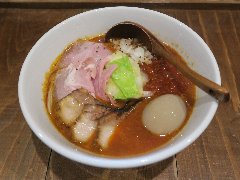 ![]() | 板橋駅西口から1、2分、板橋駅西口商店会沿いにあります。2階建ての建物の1階です。板張りの壁の外観です。店内は、カウンター席が7つ、座ると後ろも通りづらくなるくらい狭いです。店主は元フレンチのシェフだそうです。鯛塩濃厚そばのランチセット(1000円)を注文しました。レタス、チャーシュー(2種類)、穂先メンマ、ゴボウは入って、辛味噌が添えてありました。麺は、細めのストレートです、スープは、鯛の出汁で白濁していました。旨味が濃厚ですがスープは少なめでした。セットの鯛出汁茶漬けには鯛の刺身が乗っていました。鯛飯自体がいい味です。スープを掛けて頂きます。美味しかったです。他には、汁無し鯛塩そば、汁あり鯛担麺、汁無し鯛担麺、などがありました。 |