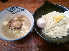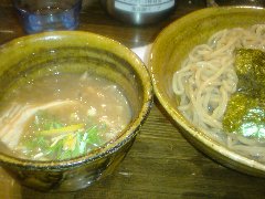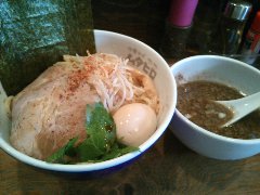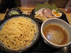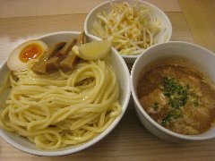 つけ麺 | ラーメン | 東京都葛飾区亀有 | ★★ (2010.12.29) | 普通 | ![]() | 亀有駅北口から徒歩3分くらいのところにあります。13時半過ぎでしたが店の外に12人の列が出来ていました。店内には4人ずつ案内されます。入口には完全4人入れ替え制と書かれていました。30分ほど待って店内に入れました。店内はL字型のカウンターが8席あって半分ずつ入れ替えています。このため店内で待っている人はいません。なので見られながら食べるということが無いのです。カウンターには「当店のこだわり」なるのもが書かれていて、トッピングが別皿、日替わりの薬味、フルーツ酢と書かれていました。特製つけ麺(中盛)(950円+50円)を食べました。1人ずつ定食屋のようなお盆の上に、大きな皿で3種類のチャーシュー、味玉、海苔、メンマ、別皿で刻みネギ、別皿で本日の薬味(梅味)が出されました。麺は太麺です。スープは動物魚介のWスープです。かなり美味しいです。しかし中盛りの麺に対してスープの量が少ないため、最後の方はスープが薄まり冷たくなってしまいました(実はスープのお代わりが出来るみたいです)。スープ割りも出来ます。帰る時にも行列は減っていませんでした。 |