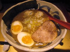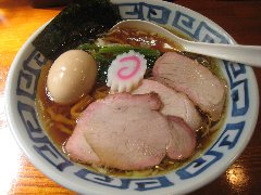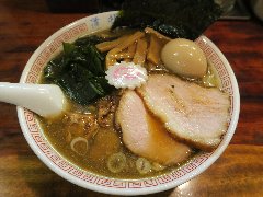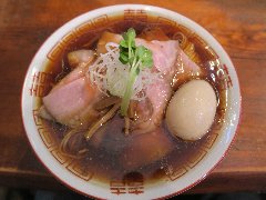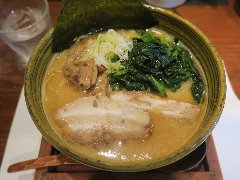 竹の助 | ラーメン | 東京都町田市三輪町 | ★★★ (2014.5.10) | 普通 | ![]() | 柿生駅から10分強、鶴川高校の近くの住宅街にあります。何故ここに?といった場所です。店内は、カウンター席が10、小上がりにテーブルが2つあります。味玉中華そば(750円)を食べました。チャーシュー、なると、ほうれん草、海苔、メンマ、味玉、刻みネギが入っていました。チャーシューは外側が赤くなっています。麺は自家製で縮れています。厨房の奥に麺打ちの青竹が見えてました。スープは鶏ガラで透き通ってきれいです。表面の油は多めです。美味しかったです。 |