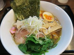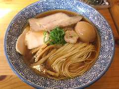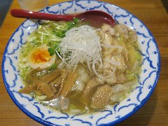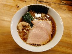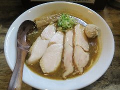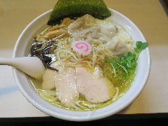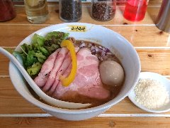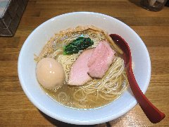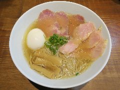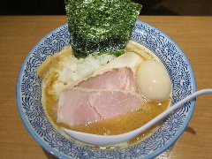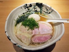 ![]() | 三鷹駅北口から4、5分、八丁通り沿いにあります。マンションの地下1階にあります。焼き鳥屋がランチの2時間のみラーメン屋として営業しています。玄関の前には石庭がありました。店内、はカウンター席が9つありました。厨房が広いです。やや薄暗く静かで上品な雰囲気があります。たくさんの日本酒が並んでいました。特製塩そば(1000円)を注文しました。岩のり、チャーシュー(鶏むね、鴨ロース、豚ロース)、味玉、ワンタン、刻みネギが入っていました。麺は細めのストレートです。スープは鶏と鴨と節などの出汁、透き通っていてすっきりした鶏の旨味があります。ワンタンは鶏と海老、生姜が効いています。美味しかったです。チャーシューも美味しいです。他には、塩生姜そば、醤油そば、担担麵などがありました。お店を出ると行列でした。 |