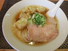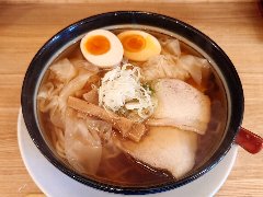 ![]() | 三鷹駅南口から10分ほど、中央通り沿いにあります。マンションの1階です。木の看板が出ています。店内は、カウンター席が7つ、テーブルが4つりました。明るくてきれいです。秋田の酒田にある本店は創業は昭和35年だそうです。煮玉子ワンタンメン(1100円)を注文しました。煮玉子、メンマ、ワンタン、チャーシュー、刻みネギが入っていました。麺は中細で縮れていました。スープは山形地鶏やアゴ煮干し、野菜などの出汁、旨味が豊かです。薄皮のワンタンはつるつるでとろとろでした。美味しかったです、他には、スタミナワンタンメン、塩ワンタンメン、冷しワンタンメンなどがありました。 |