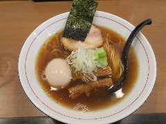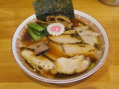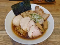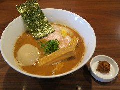 ![]() | 国領駅から1、2分、ターミナルの向かいにあるビルの1階にあります。一見、何屋か分からない外観です。柴崎亭の系列店のようです。店内は、カウンター席が10ありました。厚い一枚板のカウンター、黒壁ですが明るいです。特製八王子中華そば(1200円)を注文しました。パン、チャーシュー、メンマ、ワンタン、カイワレ、刻み玉ねぎが入っていました。麺は細めのストレート、ワンタンは薄皮です。スープは、魚介系の出汁に動物系も感じます。スープがきれいで見た目がいいです。すっきろした味わいで少し酸味がありました。チャーシューが厚くて柔らかいです。美味しかったです。他には、煮干ブラック、担々麺、味噌らーめんなどがありました。 |