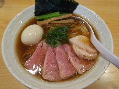 牛骨らぁめん | ラーメン | 東京都足立区千住東 | ★★ (2014.2.1) | 小高 | ![]() | 北千住駅東口から2分ほど、東町商店街沿いにあります。開店前に9人の行列が出来ていました。店内はカウンター席が8つのみです。前のグループが3名で後回しになったため、1周り目で入店できました。椅子は床に固定されていてちょっと狭いです。水は赤いコップです。 カウンターが低く厨房が近いです。黙々と調理する店主に、若干、緊張感が漂います。リズミカルな湯ぎりなど工程が全部見えます。贅沢焼牛らぁ麺(1000円)を食べました。牛のチャーシュー(2枚)、細いメンマ、味玉、ひき肉、刻みネギが入っていました。麺は細めです。スープはきれいな牛骨や魚介のスープ、少し甘いです。美味しいです。食べたことの無い味でした。塩らぁ麺、つけ麺、油そば、などもあります。 |