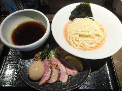 ![]() | 新小岩駅から3、4分、平和橋通りを渡り、有名なラーメン屋の前を通り過ぎた先にあります。2階建ての1階、近所は飲み屋が並んでいました。木製の引き戸で和風な感じです。店内は、カウンター席が6つ、背後に大きな冷蔵庫が並び狭く感じます。ご主人は一燈の出身だそうです。特製醤油つけ麺(1300円)を注文しました。別皿に鴨チャーシュー、ほうれん草、メンマ、肉そぼろ、刻みネギ、レモンが入っていました。丁寧に盛られていました。麺は太めで手揉みで縮れ、海苔が添えられピンク色の昆布水に浸かっていました。つけ汁は鴨出汁などから作ったスープに鴨脂、生揚げ醤油などのかえしから作られます。すっきりした味わいでやや甘いです。モチモチした麺は昆布水だけでも全然いけます。美味しかったです。スープ割りも美味しいです。手間が掛かっているようなのでこの値段は妥当なのかな。他には、鴨白湯つけ麺、鴨カレーつけ麺、中華蕎麦などがありました。 |
