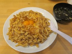 ![]() | 東府中駅北口から1、2分、都道229号の京王線の踏切の近くにあります。ビルの1階です。赤い暖簾が掛かっていました。店内は、カウンター席が5つ、テーブルが2つありました。小ぢんまりしていました。ラグビーのポスターがたくさん貼られていました。月見肉かけチャーハン(850円)を注文しました。スープが付きます。チャーハンの上に大量の豚肉が入った甘じょっぱい餡、卵が2個乗っていました。やや濃いめの味付け、卵を混ぜるとマイルドになります。特製ラー油で味変もありです。美味しかったです。他には、各種中華料理、ブラックチャーハン、しじみラーメンなどがありました。 |