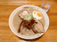 ![]() | 立川駅南口から2分ほど、駅の近くの飲食店が並ぶ路地にあります。ビルの1階です。えんじ色の庇の看板が目印です。店内は、カウンター席が7つありました。小ぢんまりとして、黒壁でちょっと圧迫感がありました。鶏肉らーめん(1000円)を注文しました。太いメンマ、鶏肉チャーシュー、鶏つみれ、刻みネギが入っていました。麺は普通の太さのストレートです。スープは濃厚な鶏白湯、とろみがあり鶏、野菜、魚介の旨味が凝縮していました。大きな鶏チャーシューが4枚入っていました。美味しかったです。鶏つみれも美味しいです。他には、中華そば、紅らーめん、油そばなどがありました。 |