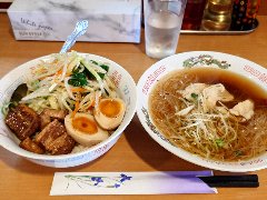中華めん処 | ラーメン | 東京都板橋区成増 | ★★ (2018.11.3) | 普通 | ![]() | 地下鉄成増駅から1分、国道254号沿いにあります。数人の行列が出来ていました。店内は、カウンター席が10、テーブルが3つありました。店内の階段でも待ち客がいました。特製中華そば(1050円)を注文しました。海苔、チャーシュー、角煮、わかめ、ナルト、メンマ、味玉、刻みネギが入っていました。麺は自家製、やや太めで縮れていました。スープは煮干し出汁がメインです。いい香りで美味しいです。豚モモのチャーシューも美味しかったです。スープも具もちょうどいい塩加減を目指しているそうです。他には、塩らあめん、つけめん、焼き餃子、水餃子などがありました。店員さんがみな楽しそうに仕事をしていました。 |