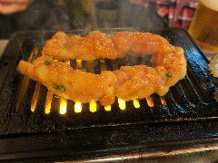 桜木町駅から5分、野毛の繁華街にあります。野毛たべもの横丁という建物の中にあります。狭い通路を挟んで7軒の小さなお店が並んでいます。隣のお店との仕切りはありますが、通路からは丸見えです。当然向かいのお店のお客も見えます。ちょっとディープな雰囲気です。店内は、カウンター席が9つ、テーブルが3つありました。大衆焼肉のレトロな雰囲気です。一本ホルモン(999円)、究極のホルモン(880円)、マルチョウ(490円)、牛ハラミ(590円)、牛塩タン(690円)などを注文しました。一本ホルモンは長いマルチョウで、店員さんが豪快に焼いて切り分けてくれます。ホルモン系はどれも臭みがなく美味しかったです。牛も美味しいです。他には、各種ホルモン、黒毛和牛、網ごとカルビ、パワハラ、チキン野郎、全盛期のレバーなどがありました。ネーミングが面白いです。 |