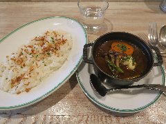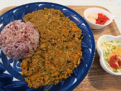 鎌倉駅東口から5分ほど、小町通り沿いにある、こもれび禄岸という商業施設の2階にあります。1階に大行列が出来ていて焦ったのですが他にお店でした。店内は、カウンター席が6つ、テーブルが9つありました。白壁で明るく、レトロなテーブルと椅子がお洒落な雰囲気を出しています。和風キーマカリー(1200円)を注文しました。豚ひき肉と根菜、青ネギ、温泉玉子が乗っています。スパイスに味噌でしょうか、ちょっと甘いです。カレーという感じではないですが、美味しいです。でも高いです。漬物とくるみの小さなお菓子が付きます。他には、チキンカリー、エスニックそぼろカリー、スリランカ風マトンカリー、カスタードプリンなどがありました。平日なのに混んでいました。因みにお客の女性率はかなり高いです。 |