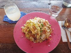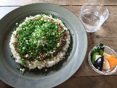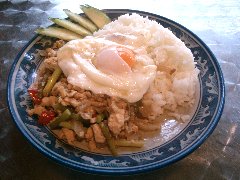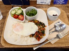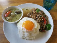 淵野辺駅南口から1分、マンションの2階にありちょっと分かり辛いです。店内は、カウンター席が4つ、テーブルが6つありました。何となくエスニックな雰囲気です。ランチメニューから、鶏肉バジル炒めご飯(パットガパオガイ)(750円)を注文しました。ご飯の上に、キュウリ、細かい鶏肉、ニンニクの茎、玉ねぎ、パプリカ、目玉焼きが乗っていました。ご飯はタイ米です。美味しいですが、あまりエスニック感はなかったです。ランチはドリンク付き(アイスコーヒー、ウーロン茶、アイスレモンティ、リンゴ、オレンジから選択)です。ドリンクはジョッキで出されました。他のランチメニューには、タイカレーライス、タイエビチャーハン、海鮮トムヤムクンラーメンなどがありました。 |