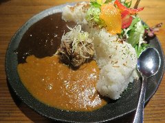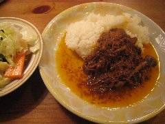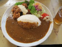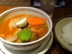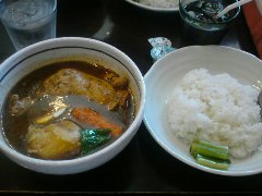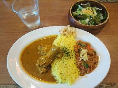 ぢどりや | カレー | 神奈川県横浜市中区常盤町 | ★ (2014.2.3) | 普通 | ![]() | 関内駅北口から2分ほど、常盤町三丁目の交差点の近くの路地にあります。焼き鳥の居酒屋です。店内はオーソドックスな居酒屋風です。厚い木のカウンター席が7つ、テーブルが5つありました。ランチでは大山鶏チキンカレーとキーマカレーが食べられます。大山鶏チキンカレー(750円)を食べました。野菜が溶けたようなカレーには骨付き鶏が2本入っていました。割と辛いです。ライス大盛は無料です。玉ねぎの漬物が乗っていました。サラダとコーヒーが付きます。夜はおでんもあるようです。 |