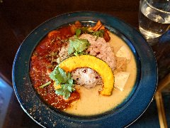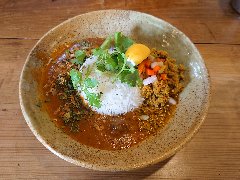 関内駅北口から5、6分、伊勢佐木町通りから路地に入った辺りにあります。やや怪しいエリアです。丸祇羅は、まるまさらと読みます。ビルの3階にあり狭い階段を登りますが、知らないと入り辛いと思います。店内は、カウンター席が8つ、テーブルが3つありました。やや薄暗いですが窓から光が入ります。音楽は無しで鈴虫の音が流れていました。ちょっと変わった雰囲気です。メニューは一択、本日の丸祇羅(1200円)を注文しました。ライスの量は普通にしました。平べったい皿に、レッドポークカリー、キーマ、メティダル、バスマティライスの上に、人参、キャベツ、春菊、赤玉ねぎ、ポテトサラダなどが乗っていました。色鮮やかです。ポークはややスパイシー、キーマは肉々しく和風な味付けでした。美味しかったです。お皿が浅いので全体的に量は少なめです。他には、トッピングにスパイス味玉、ホタテアチャール、エビカリーなどがありました。 |
