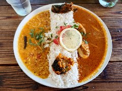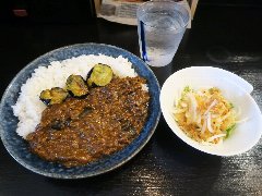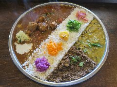![]() | 四条大宮駅から南に5分ほど、高辻通り沿い、大宮高辻の交差点から西に少し進むとあります。ムジャラとは水木しげる先生の妖鬼化に由来するそうで、ちょっと怪しげな外観です。店内は、カウンター席が5つ、テーブルが3つありました。青い壁、怪しげな照明、独特な雰囲気があります。カレー3種盛り(1400円)を注文しました。カレーは、チキンカレー、やさいカレー、ブタバラカレーの3種類です。やさいカレーは茄子と大根です。その他、キャベツ炒め、玉ねぎのアチャール、ムング豆、キウィソース、よく分からない何か、などいろいろなものが乗っていました。ご飯は白米とバスマティが半々です。スパイシーですが辛くはないです。それぞれ美味しいですが、いろいろ混ぜるとより美味しくなりました。面白いカレーでした。メニューは、日替わりの3種類のカレーのみです。 |