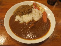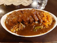 ヴィラ・アフガン | カレー | 山梨県北杜市大泉町西井出 | ★★ (2016.6.17) | 普通 | ![]() | 甲斐大泉駅から2km弱、県道28号を天女山方面に北上すると道沿いにあります。辺りは高原の雰囲気が漂います。木々に囲まれた洋館で、道からは注意していないと見過ごします。玄関を入るとちょっと怪しげな雰囲気です。店内は撮影禁止、でも料理はOKだそうです。階段で2階に上がります。テーブルが多数ありました。薄暗く、天井が高く、壁には鹿の剥製、アンティークな置物、怪しい洋館の雰囲気たっぷりです。ベーコンエッグとローストポークカレー(1600円)を注文しました。辛さ(4段階)とご飯の量(3段階)を選びます。ご飯の上に、目玉焼き(2個)、巨大なベーコン、ローストポークが乗っていました。カレーは壷のような容器には行っています。コクのある欧風なカレーで美味しいです。ベーコンもローストポークも分厚くて美味しいです。トータルでかなりのボリュームです。他には、ショルダーベーコンカレー、ソーセージカレー、きのこカレー、シーフードカレーなどがありました。 |