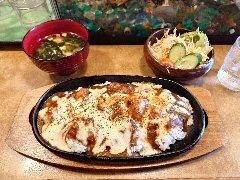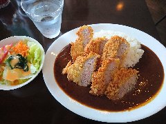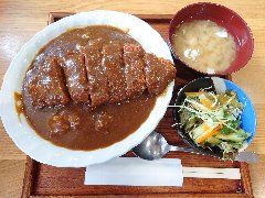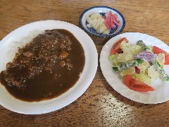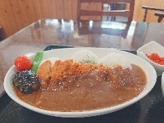 ![]() | 中央道の河口湖ICから5kmほど、国道139号の大和田西の交差点から南に少し進むとあります。富士山のふもとです。青い屋根が目印です。店内は、カウンター席が5つ、テーブルが多数ありました。けっこう広いです。どこか懐かしい雰囲気です。カツカレー(1100円)を注文しました。サラダ、味噌汁が付きます。大きくて分厚い揚げ立てとんかつが乗ります。カレーはトロトロ、見た目より辛めでした。お皿も深くてボリュームありました。美味しかったです。他には、しょうが焼き、ハンバーグ、オムライス、そば、ラーメンなどがありました。営業時間は朝7時から14時です。 |