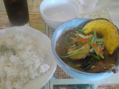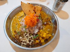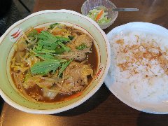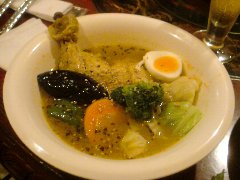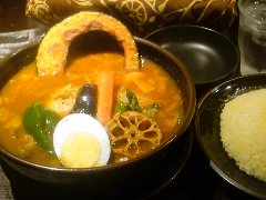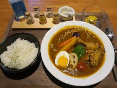 武蔵中原駅から3、4分、南武線沿線道路沿い、南武線のガード下にあります。オレンジ色の壁に大きな垂れ幕が目立ちます。店内は、カウンター席が6つ、テーブルが6つ、奥にもテーブル席がありました。夜はジンギスカンのお店のようで、テーブル席には排煙ダクトが設置されています。札幌クラシック(中辛)(840円)を注文しました。ライスとサラダが付きます。カレーはスープカレー、キャベツ、人参、水菜、アスパラガス、もやし、サツマイモ、シメジ、鶏肉が入っていました。大きな器で具沢山です。ライスも多くてかなりのボリュームです。しかも安いです。他には、牛すじスープカレー、ラム&Wトマトスープカレー、各種つけ麺などがありました。夜はジンギスカンや焼肉メニューのようです。 |