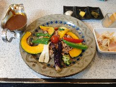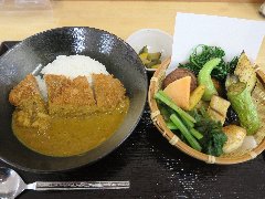 鎌倉駅東口から6、7分、小町通りから路地に少し入った場所にあります。小町通りは混雑してますが、少し入っただけで静かです。鎌倉リーフという法人農家が経営するカレー屋のようです。普通の民家の路地に面している側をお店にした感じです。店内は、カウンター席が6つ、テーブルが3つありました。入口付近には鎌倉野菜やTシャツが売られています。狭いですがきれいで明るいです。カツカレー(1274円)を注文しました。どのカレーにもたくさんの素揚げした鎌倉野菜が付きます。この日の野菜は、白茄子、緑茄子、甘長ししとうor万願寺、日本かぼちゃ、金美人参、トランペットズッキーニと書かれていました。カレー自体は美味しいのですが、カレー(ルー)の量が少なめで、カツはいらなかったかもしれません。野菜は美味しかったです。その他、かん太カレー、キーマカレー、よくばりセットなどがありました。 |