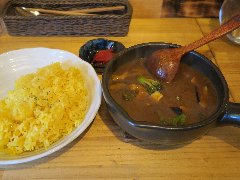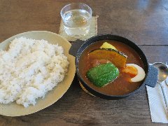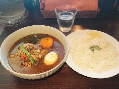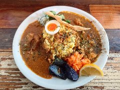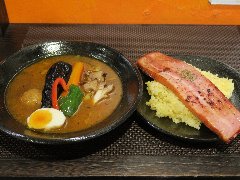 ![]() | 花巻駅東口から7、8分、県道297号を少し北上した辺りにあります。夜は暗くてちょっと分かりづらかったです。店内は、カウンター席が11、テーブルが5つありました。割りと広々していました。店内は明るいです。入口付近には野菜が並んでいました。厚切りグリルドベーコンカレー(黒糖入り)(1134円)を注文しました。辛さは60倍以上は追加料金、100倍まで出来ます。30倍にしました。黒糖はコクが出るそうです。カレーには、茹で玉子、ナス、ジャガイモ、ピーマン、舞茸、人参、パプリカ、カボチャ、キャベツが入っていました。ライスには驚きの大きさのベーコンが乗っていました。カレーは旨味たっぷりでサラサラでです。30倍はそれほど辛くはなかったです。とても美味しかったです。ボリュームあって安いです。他には、グリルドチキンカレー、エビのスープカレー、角煮のスープカレーなどがありました。 |