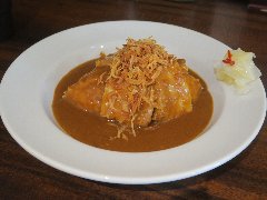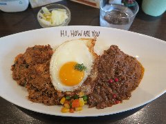 鶴見駅西口から南に4分ほど、大学病院の前辺りにあります。庇に淡路島咖喱と書かれていました。庇のせいかちょっとくたびれた外観に見えます。店内は、カウンター席が3つ、テーブルが4つ、2階席もあるようです。外観と違って明るくてきれい、サーフボードが飾られたりハワイアンなカフェの雰囲気です。淡路島スタウトポークカレー(レギュラー)(1000円)を注文しました。カレーには、フライドオニオンとスタウトポークが2枚乗っていました。スタウトポークはスタウトビールで煮込んだ豚バラ肉、柔らかいです。カレーはとろみがあって甘味が強くスパイシーさは控えめです。淡路島の玉ねぎが1人前に1個と鶏ガラスープ、スパイスから、淡路島の工場で作られるそうです。美味しかったです。他には、ポークビーンズカレー、バターチキンカレー、ハヤシライスなどがありました。 |