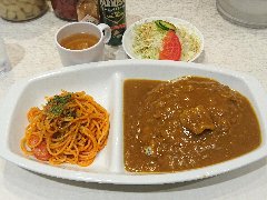 相鉄線の横浜駅から2分、相鉄ジョイナスの地下2階の飲食店フロアの端っこにあります。メニューサンプルがたくさん並んでいます。店内は、カウンター席が多数ありました。明るくてきれいです。テーブルの上には福神漬けとラッキョウが置いてありました。半スパカレーセット(880円)を注文いました。カレーの辛さは、甘口、中辛(が通常)、大辛、激辛から選べます。サラダとスープが付きます。粉チーズとタバスコも付きます。カレーは、17種類のスパイス、鶏ガラ、ココナッツミルク、玉ねぎ、にんじん、リンゴなどで作るそうです。トロトロなタイプで割りと甘め、中辛はほとんど辛くなかったです。ナポリタンはケチャップ感があります。普通に美味しかったです。他には、カツカレー、フランクカレー、ハンバーグカレー、ミートソースなどがありました。店員さんは丁寧でした。 |