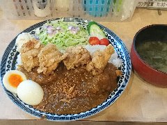淵野辺駅北口から3、4分、線路沿い矢部駅方面に向かうとあります。梵カレーgoldの看板が目立っています。店内は、カウンター席が7つ、テーブルが3つありました。学生がいっぱいいました。から揚げカレーgold並(900円)を注文しました。ランチは味噌汁が付きます。唐揚げは注文後に揚げていました。カレーには、唐揚げ3個、手羽元、茹で玉子、サラダ、ポテトサラダが乗っていました。基本の梵カレーは、手羽先、19種類のスパイス、野菜、果物、スパイスから作るそうです。粘度のあるタイプでけっこう甘くややスパイシーでした。唐揚げは揚げ立てです。美味しかったです。ボリュームあります。他には、梵カレーgold、チキンカツカレー、焼きチーズカレー、ダークマターカレーなどがありました。定食もあります。 |