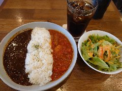 カレー堂 | カレー | 神奈川県相模原市中央区淵野辺 | ★ (2013.12.10) | 普通 | ![]() | 淵野辺駅北口から5分ほどのところにあります。店内はカウンター席が4つ、テーブルが6つありました。日替わりランチメニューから、チキンカレー(850円)を食べました。サラダ、ライスかナン、スープ、ドリンクが付きます。店員さんの勧めでハーフナン&ハーフライスにしました。さらにサービスでナンはハーフではなくて通常サイズにしてくれました。ドリンクは、マンゴーラッシーにしました。スープはえびでした。チキンカレーにはモモ肉が入っていました。美味しいです。ナンを普通サイズにしたためカレーが足りなくなってしまいました。 |