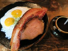 西横浜駅から南に5、6分、サンモール西横浜商店街にあります。食事が充実している喫茶店です。赤いテントにコーヒー豆の麻袋が目印です。店内は、テーブルが4つありました。小ぢんまりしています。テーブルカバーの下にも麻袋が敷いてありました。入口付近には焙煎機がありました。コーヒーのいい香りがします。ビューカレー(800円)を注文しました。トッピングを6つから選べます。ハンバーグにしました。ステンレス製の皿で出されます。カレーの上にけっこう大きいハンバーグと目玉焼きが乗っていました。カレーはやや甘め、ライスは少なめです。帯広のインディアンカレーを目指しているそうです。食後に小さいアイスコーヒーが付きます。美味しかったです。他には、各種ドリンク、ナポリタンブラボーノ、旬の野菜と半熟卵のちょい辛キーマカレーなどがありました。 |
