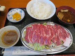 ![]() | 長野駅から17kmほど、国道19号沿い、犀川の辺の長閑なところにあります。ジンギスカンのお店が多いエリアです。大きな駐車場の奥に平屋の建物があります。店内は、テーブルが6つ、座敷もあります。けっこう広くてきれいです。サフォークラムジンギスカン(890円)、マトンロースジンギスカン(740円)、ライス(225円)、玉子スープ(435円)を注文しました。野菜付きです。ラムはどちらも柔らかく臭みは全くありません。特製タレが食欲をそそります。ボリュームもありました。美味しかったです。他には、サフォークラムロース、ラム骨付きロース、牛ロース、牛カルビなどがありました。中途半端な時間でしたがけっこう混んでいました。 |