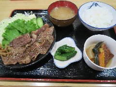 ![]() | 国道102号と国道103号の交差点の近く、十和田湖温泉街にあります。オレンジ色の看板と赤暖簾が目印です。店内は、テーブル席が4つ、カウンター席が3つ、座敷にテーブルが2つありました。壁にはメニューの短冊がいっぱい貼られていました。牛バラ焼き定食(1150円)を注文しました。ご飯、味噌汁、生卵、マカロニサラダ、漬物が付きます。コンロに乗った鉄板に、大量の玉ねぎ、その上に牛バラが乗りタレが掛かっていました。自分で焼きます。牛バラは柔らかく玉ねぎはしんなりします。甘しょっぱい濃いめのタレと生卵がよく合います。牛肉は県内産だそうです。ボリュームもあり美味しかったです。他には、ラーメン、牛バラ焼き丼、カレーライス、せんべい汁などがありました。 |