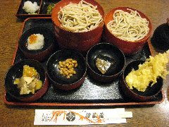 | そば処 伊藤屋 | そば | 山形県天童市三日町 | ★ (2009.8.18) | 普通 | ![]() | 天童駅の近くにあります。町の蕎麦屋さんといった建物です。歴史のとても古いお店で開業はなんと1850年、現在の店主は7代目だそうです。五段蔵そば(1100円)を食べました。5段重ねに小分けにされた蕎麦と、5種類の薬味が入ったお椀が付きます。お椀は、大根おろし、納豆、きのこ、にしん煮、海老天の5種類です。蕎麦の方につゆと薬味を乗せて食べます。きのこ、にしん煮は美味しかったです(海老の天ぷらは硬かった・・・)。いろいろ楽しめてよかったです。 |
