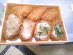 壺屋 | 和食 | 愛知県豊橋市花田町西宿 | ★ (2013.2.15) | 普通 | ![]() | 豊橋駅の駅ビル、カルミアの南館の連絡通路にあります。テイクアウト専門の弁当屋ですが、名物は稲荷寿しです。この稲荷寿しは豊橋駅の名物駅弁として駅構内でも売られています。壺屋の創業明治22年だそうです。三色稲荷(570円)を食べました。通常の稲荷寿し、わさび菜入り稲荷寿し、ちりめん山椒入り稲荷寿しの3種類が入っています。周りのアゲが結構甘くて濃い味付けなので、わさび菜入りが口直しにいいです。美味しかったです。包み紙に豊川稲荷神社のお狐さまが描かれていてレトロな感じがいいですね。 |