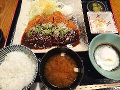![]() | 栄駅から4、5分、NHK名古屋放送センタービルの地下2階の飲食店街にあります。お店の外にメニューサンプルが並んでいました。店内は、カウンター席、テーブル席、座敷のテーブル席がありました。割りと広いです。厚切りロースかつ定食(1320円)と味噌ソース(110円)を注文しました。定食には、ご飯、味噌汁、温玉、豆腐、漬物が付きます。ご飯、キャベツ、味噌汁はセルフでおかわり出来ます。味噌ソースの上には刻みネギが乗っていました。ロースかつは大きくて軟らかく、やや脂身が多めでした。美味しかったです。他には、ヒレカツ、大海老フライ、黒カレー、名古屋定食などがありました。けっこう混んでました。 |