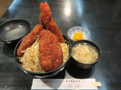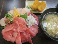 ![]() | 清水駅東口から4、5分、清水魚市場内にある河岸の市まぐろ館の1階にあります。10時開店との情報でしたが、実際開店したのは10時40分過ぎでした。店内は、テーブルが6つくらいありました。まぐろ三種丼(2179円)を注文しました。あら汁が付き、まぐろフライは食べ放題です。まぐろ三種丼には、本まぐろ中トロ、上赤身、ビントロ、ネギトロ、シラスなどが乗っていました。中トロはとろけるようです。赤身は旨味があり、ビントロは濃厚です。まぐろはどれも新鮮でたっぷりと入っていてとても美味しかったです。あら汁も美味しいです。このボリュームではかなり安いです。他には、全部乗せ・大ちゃん丼、特上とろサーモン・いくら丼、まぐろ目玉の煮付けなどがありました。実は近くの蕎麦屋が経営しているそうで手打ち蕎麦もあります。 |