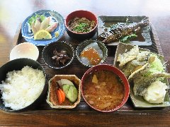 ![]() | 松本ICから40kmほど、乗鞍高原にある松本市乗鞍観光センター内にあります。3階建ての建物です。お店の前はウッドデッキになっています。店内はテーブルが多数ありました。窓から乗鞍岳が見えます。つぶら揚げ定食(1300円)と山菜天ぷら(800円)を注文しました。小鉢や漬物も付きます。つぶら揚げはニジマスの唐揚げです。甘辛のタレが掛かっていました。カラっと揚げられサクサクです。天ぷらは、ふきのとう、こごみ、タラの芽、タケノコなどでした。こちらもからり、苦みがいいです。美味しかったです。他には、生姜焼き定食、きざみうどん、カレーライスなどがありました。 |
