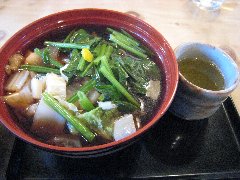 鎌倉五山 | 和食 | 神奈川県鎌倉市山ノ内 | ★ (2010.2.6) | 普通 | ![]() | 北鎌倉、鎌倉街道の横須賀線の踏み切りのすぐ近くにあります。建長(けんちん)汁が食べられるお店です。建長汁のセットや蕎麦やうどんなどもあります。建長汁(単品)(630円)を食べました。小さめに切った野菜がたくさん入っています。醤油ベースで出汁は鰹で取っているようです。ゴマ油とゆずの香りがいいですね。 |