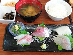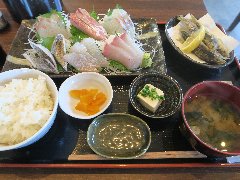 たかのや | 和食 | 神奈川県横須賀市長井 | ★ (2018.8.5) | 普通 | ![]() | 国道134号の荒崎入口の交差点から1.2km、荒崎方面に向かうとあります。海も近いです。地魚料理と看板に書かれていました。店内は、カウンターが2つ、テーブルが3つ、小あがりのテーブルが1つありました。土日祝のランチは1種類のみ、地魚の御食事(1800円)を注文しました。刺身の盛合せ、鯵フライ、ひじき、トマトのマリネ、かつおでんぶ、ご飯、味噌汁などが付きます。ご飯は1回おかわりできます。刺身は、鯵、むつ、ホウサン(ハガツオ)、イサキ、メジナ、鯖、ミズガマス、柳タコ、クラゲです。魚と野菜は全て地元産だそうです。刺身は新鮮、その他も美味しかったです。平日は、地魚と鮪のお刺身定食、海鮮丼などがあるようです。 |