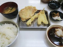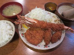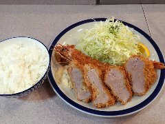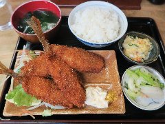 林や | 和食 | 埼玉県三郷市戸ケ崎 | ★★ (2018.5.12) | 普通 | ![]() | 八潮駅から2.2kmほど、県道67号の閘門橋の近くにあります。ちょっと歩いたら東京都です。マンションの1階です。店内は、テーブル席が3つ、座敷にテーブルが4つありました。入口近くから料理が出てくるようで、ちょっとゴチャっとしています。水槽に熱帯魚や亀が泳いでいました、ミックスフライ(ロース)のエビ・トンカツ・カキ(1350円)を注文しました。ヒレカツは終わっていました。ご飯、味噌汁、すりゴマ、漬物が付きます。ミックスフライは、天然有頭エビ、ロースカツ(80g)、カキフライ、マカロニサラダ、キャベツが乗っていました。エビフライが大きくて美味しいです。かなりボリュームがあります、さらにライスとキャベツはおかわりできます。他には、ロースカツ、ヒレカツ、ソースカツ丼などがありました。フロアの店員さんが丁寧でした。 |