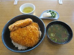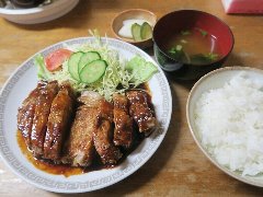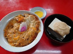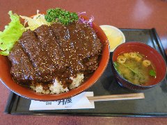 ![]() | 皆野秩父バイパスの秩父蒔田ICから10kmほど、県道37号の小鹿野高校南の交差点の近くにあります。2階建ての1階です。奥に続く大きな建物で裏には居酒屋や割烹の看板もありました。店内は、テーブルが多数ありました。広い部屋でやや殺風景、会議室のようなテーブルと椅子が並んでいました。壁に手書きのメニューが貼ってありました。三枚カツ丼(1150円)を注文しました。味噌汁と漬物が付きます。大きなカツが3枚、割りと厚みもあります。ヒレ肉でしょうか。甘辛いタレをくぐらせてしっとりとして柔らかいです。かなりボリュームがありました。美味しかったです。ただ通常のわらじカツ丼(2枚)でよかったかな。他には、肉丼、親子丼、カレーライス、ライダーズ膳などがありました。 |