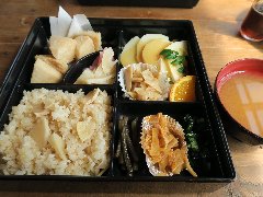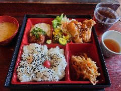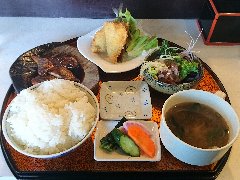 ![]() | 強羅駅から6kmほど、国道138号沿い、仙石原の交差点の近くにあります。平屋の建物です。白い提灯が掛かっていました。店内は、大テーブルが2つ、座敷にテーブルが5つありました。民芸風の装飾です。本日の日替り(1000円)を注文しました。弁当箱で出されます。マグロの山かけ、手羽先のさっぱり煮、切り干し大根などが入っていました。マグロは赤身にぶつ切り、山かけは弁当箱だと食べにくかったです。手羽先は3本、甘酸っぱいソースでした。美味しかったです。他には、とんかつ定食、豚の生姜焼き定食などがありました。普通の定食の方がよかったかも。 |