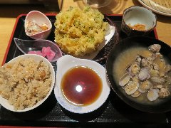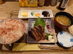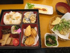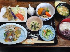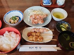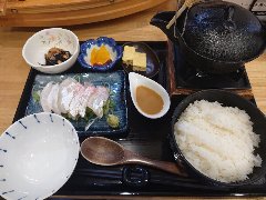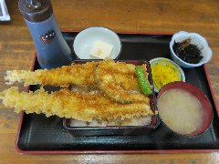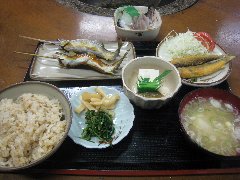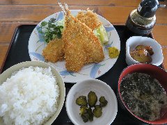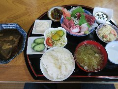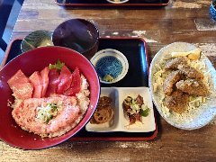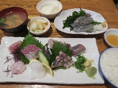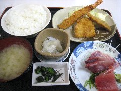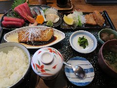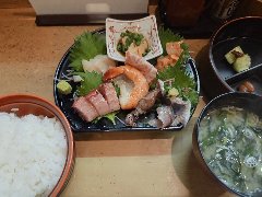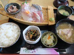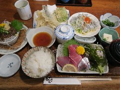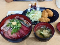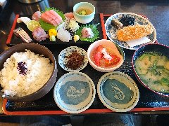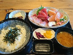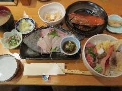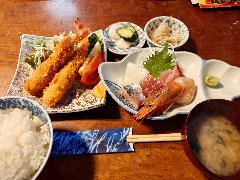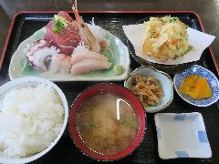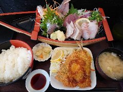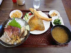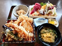 ![]() | 大津港駅から3.5km、大津岬灯台の近くにあります。2階建ての建物です。お店の前から海が見えます。店内は、テーブルが多数、座敷は掘りごたつです。明るくてきれい、窓から海が見えます。太い梁があり天井が高いです。魚力定食(2つ)(1815円)を注文しました。魚力定食はおかずの数を選べます。2つは2種類、お刺身盛りと天重にしました。因みに5つまであります。天ぷらは、えのき、エビ、ナス、春菊、じゃがいも、ブリ、かきあげでした。刺身盛りは、マグロ、北海たこ、カツオ、カンパチでした。刺身は新鮮、天重は盛り盛りでした。何気に小鉢のカツオ南蛮漬けが気に入りました。美味しかったです。魚力定食の他のおかずは天ぷら盛り、フライ盛り、焼魚、煮魚です。他には、船盛定食、おまかせ海鮮丼、やきうに丼などがありました。 |