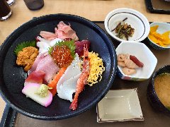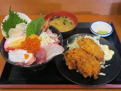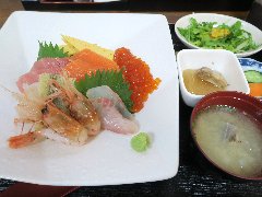 ![]() | 那珂湊駅から1kmほど、那珂湊港に並ぶ市場や飲食店街にあります。2階建ての建物です。他の行列でしたがこちらは比較的すぐに入れました。店内は、テーブルが多数ありました。市場の食堂といった雰囲気です。海鮮丼(1500円)とエビフライ(500円)を注文しました。海鮮丼には、味噌汁、煮物、山菜、漬物が付きます。海鮮丼は、ウニ、いくら、海老、イカ、サーモン、ブリ、鮪、タコ、北寄貝などが入っていました。刺身は新鮮、ウニといくらが割りと多くて嬉しいです。エビフライはぷりぷりで旨味が濃かったです。美味しかったです。他には、ウニ丼、イクラ丼、マグロ丼、大エビフライ定食などがありました。 |