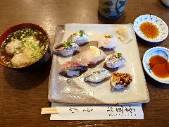 ![]() | 七里ヶ浜駅から1km弱、海から坂を登った先にある住宅街にあります。別荘地のような雰囲気があります。2階建ての建物の1階です。店内は、カウンター席が6つ、テーブルが4つありました。明るくてきれいです。おまかせ鮨+つみれ汁(2695円)を注文しました。握りは、鰯、鯖、鯵、鯛、穴子、太刀魚、鰤など、小ぶりでかわいいです。つみれ汁は、大きな鰯のつみれ、豆腐、ごぼう、刻みネギが入っていました。出汁が濃厚、しみる味わいでした。美味しかったです。他には、にぎり鮨、いわし刺身、刺身定食などがありました。 |